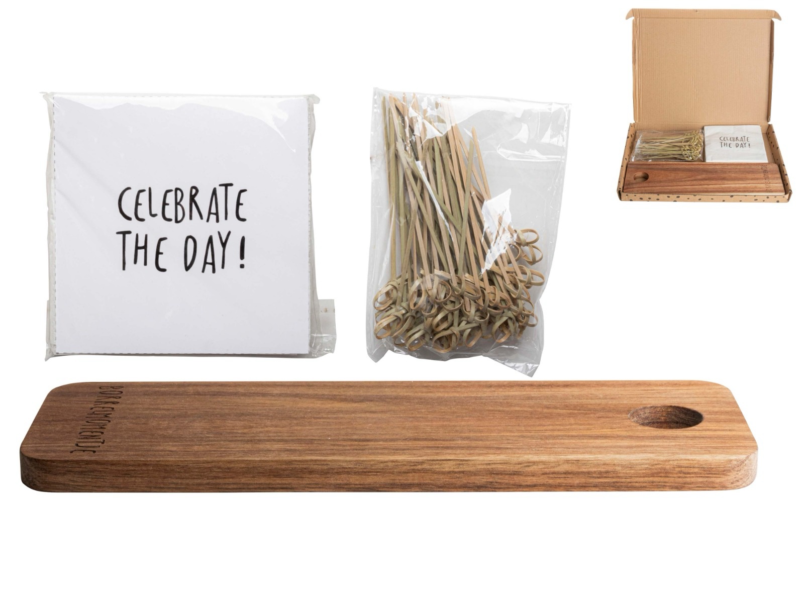 Wat valt daar nu door de brievenbus? Het is het borrelpakket van Gusta waar je vele gezellige avondjes mee gaat beleven! In de brievenbus doos vind je een stoere borrelplank met de tekst “Borrelmomentje”, witte servetjes met de tekst “Celebrate the Day!” en een zakje met knoopprikkers. Aan jou alleen nog de taak de hapjes op de plank te leggen en de borrelavond kan van start gaan.